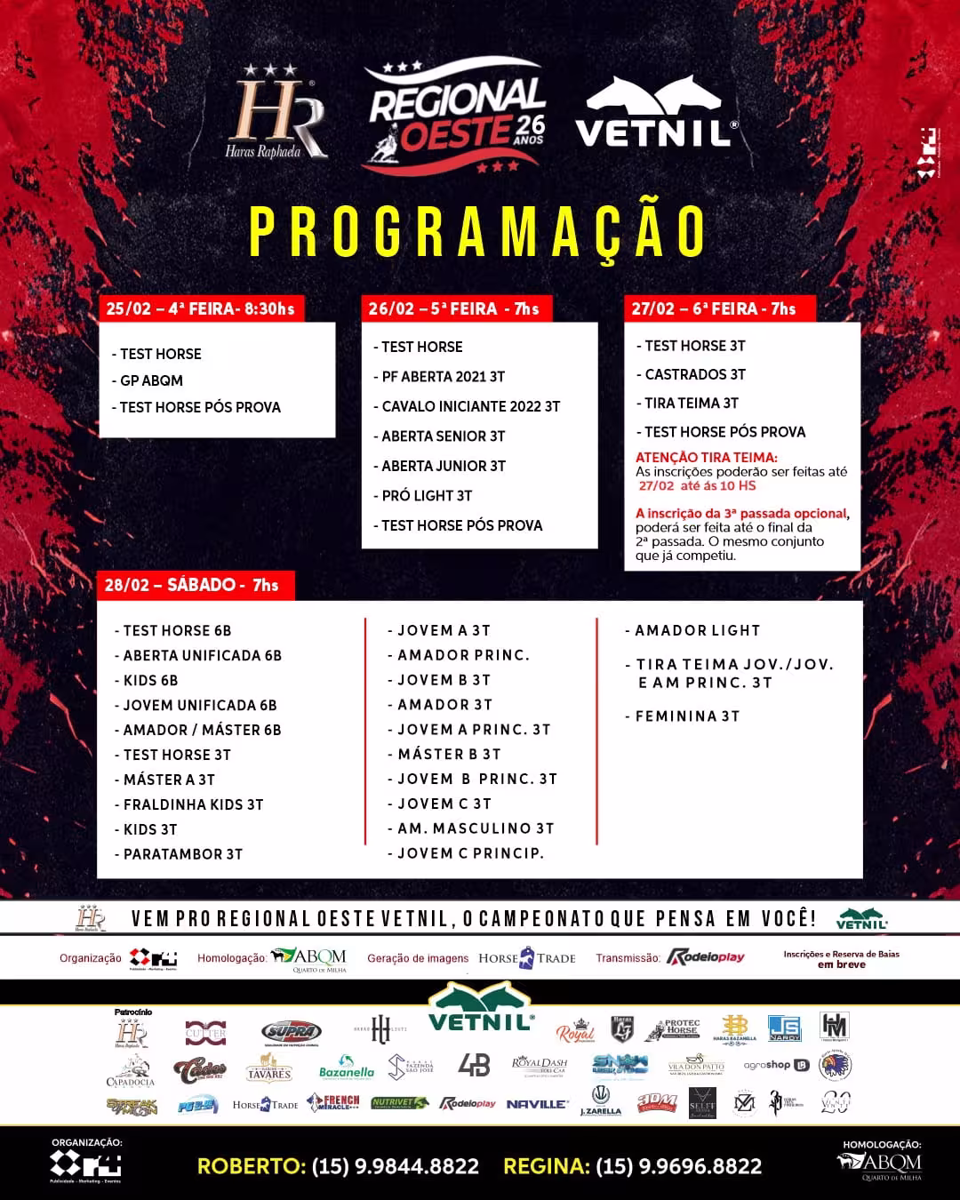 A Comissão Organizadora do Campeonato Regional Oeste, a R4 e o Haras Raphaela não se responsabilizam e estão isentos de qualquer tipo de acidente que venha a ocorrer dentro ou fora do Recinto com animais, competidores, pessoas ou bens materiais.
